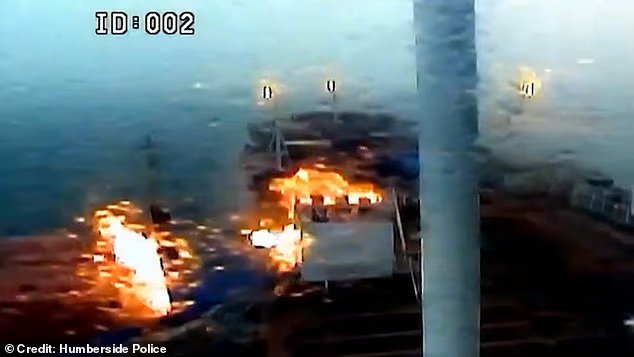 살인재판에서 컨테이너선이 불덩이에 휩싸여 유조선에 돌진하는 순간을 담은 드라마틱한 영상이 공개됐다.