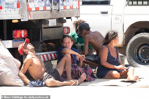 주로 현지 부족 출신의 노숙자 그룹이 무자비한 36°C 태양으로부터 배달 트럭 아래 그늘을 취하고 있습니다.