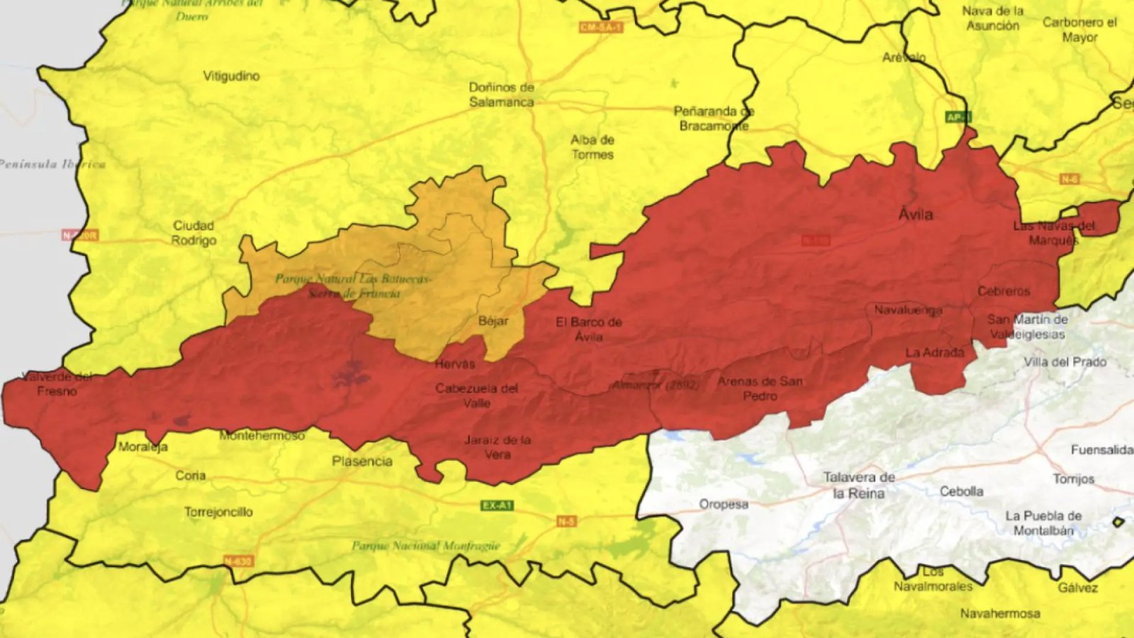 폭우와 폭풍 클라우디아로 인한 홍수 가능성으로 인한 아빌라, 카세레스 및 중앙 시스템에 대한 적색 경보