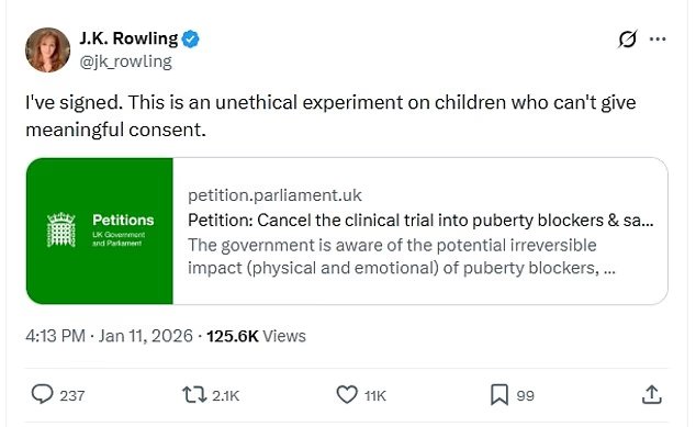 JK 롤링(JK Rowling)은 NHS의 사춘기 차단제 실험에 반대하는 청원을 지지하며 이 청원은 ‘의미 있는 동의를 할 수 없는 어린이에 대한 부당한 실험’이라고 말했습니다.